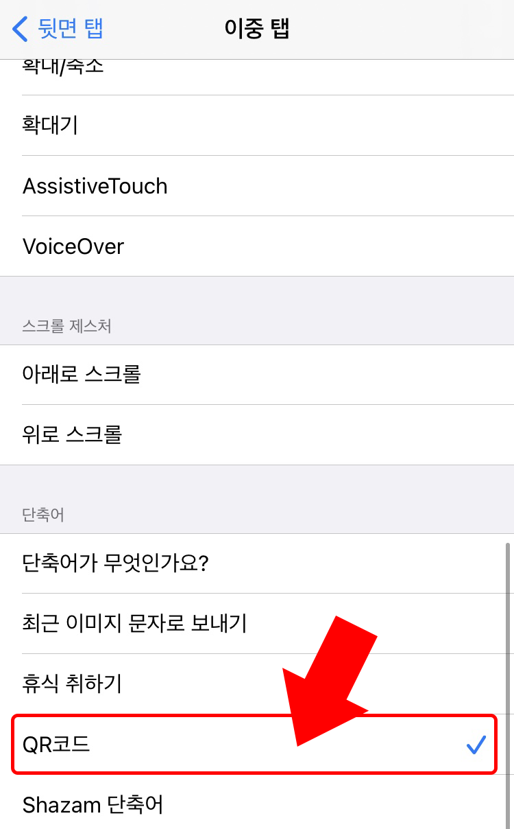 15. 자, 아래 사진처럼 이중 탭 부분에 QR코드로 설정이 되었다면 완료입니다! 이제 핸드폰 화면에서 뒷부분(사과 모양)을 톡톡 두 번 두드려주면 QR체크인 코드 화면이 뜨게 됩니다!