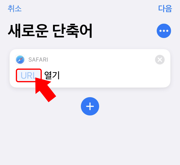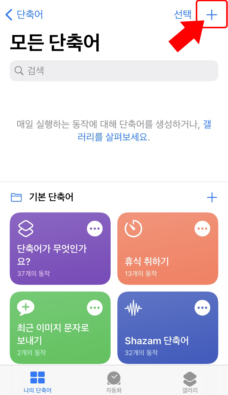 6. 단축어 앱 메인 화면에서 오른쪽 맨 위 상단의 + 버튼을 눌러 새로운 단축키를 생성해줄게요.